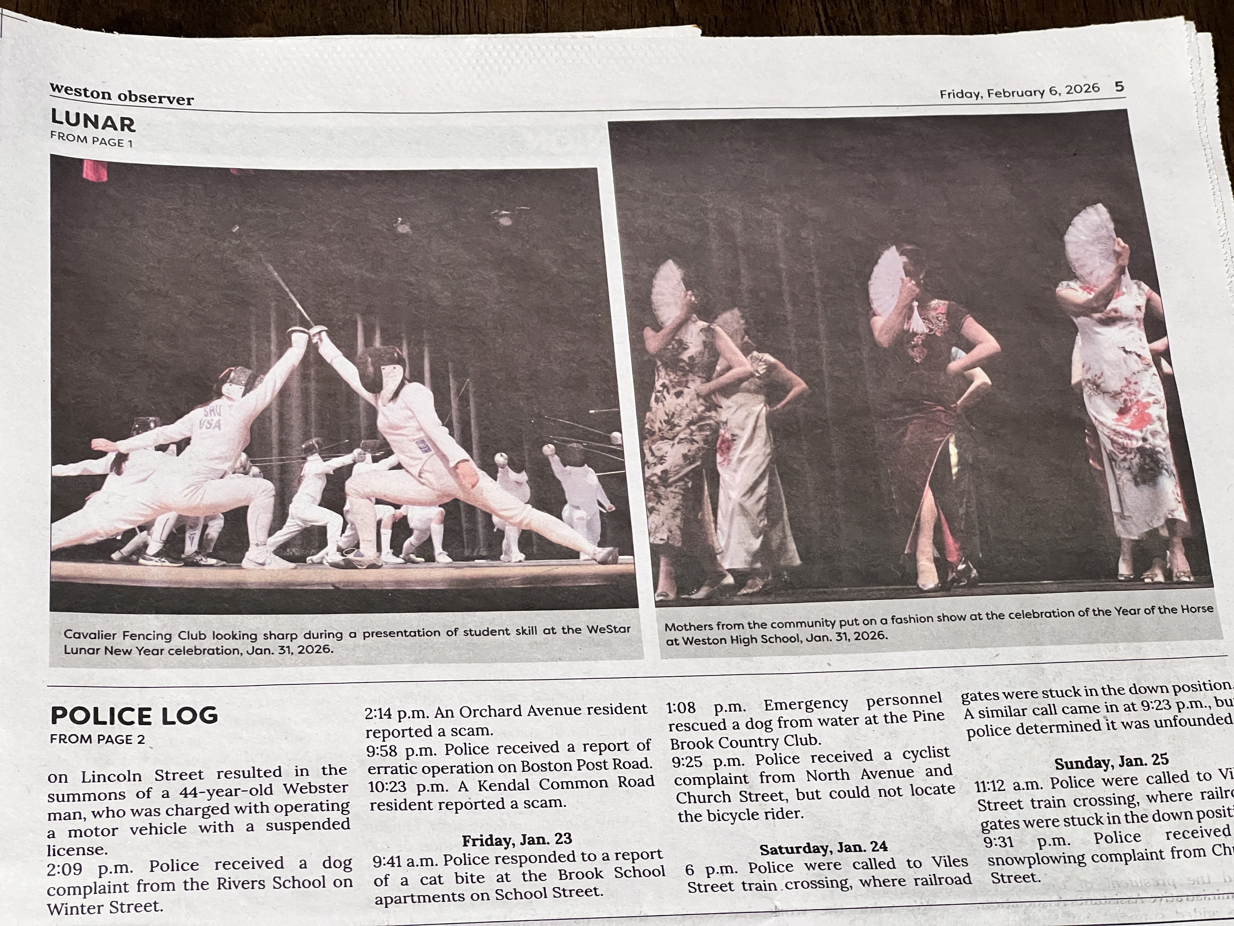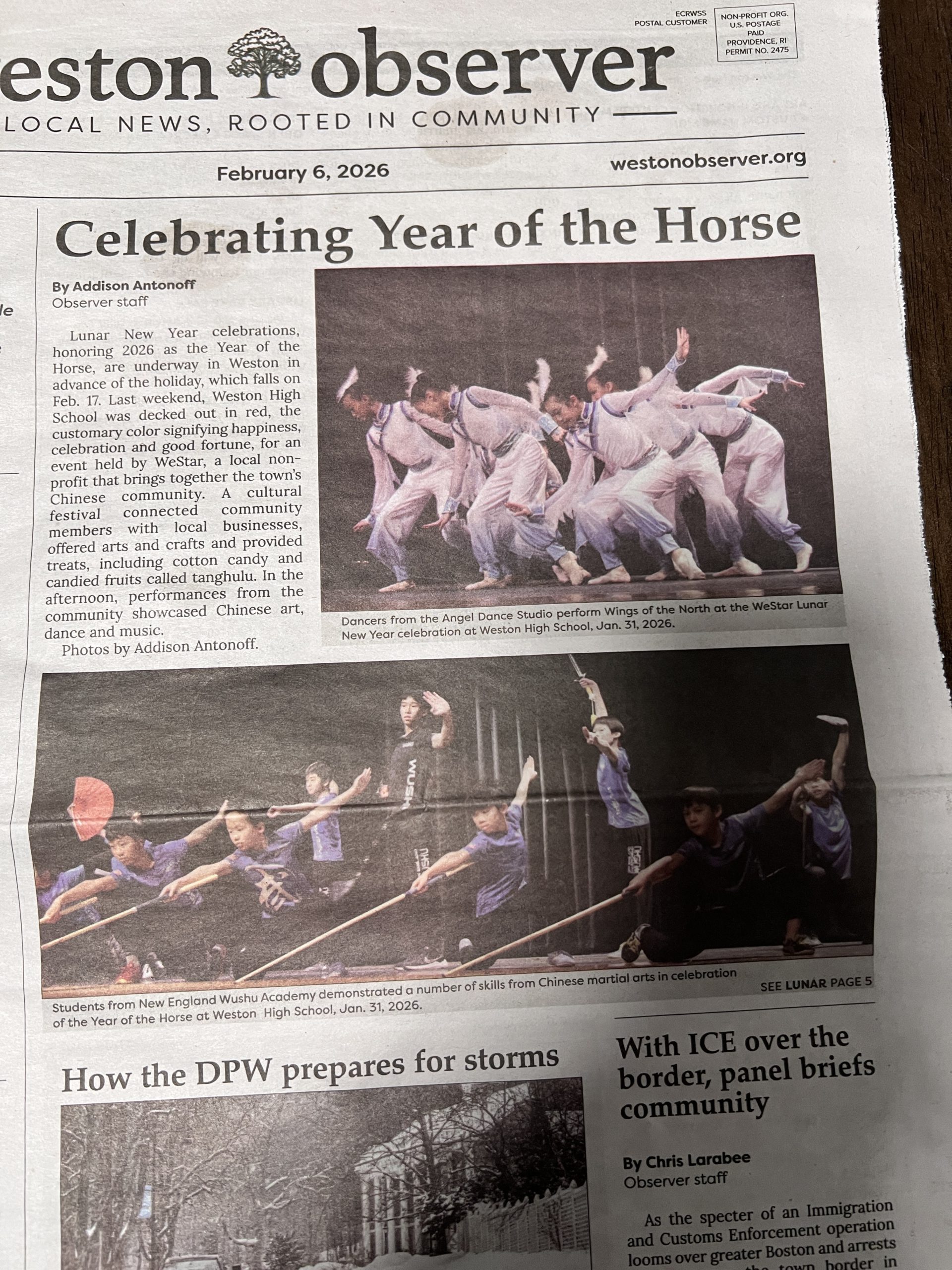 在春晚筹委会的组织和无数义工的支持下,2026马年春节庆祝活动于2026年1月31日成功在Weston高中举办。Weston本地报纸Weston Observer在头版特别报道了本次的活动。更多详细报道请点击WeStar公众号文章:https://mp.weixin.qq.com/s/N9GC9SdvD1ASVf04ZquBtg